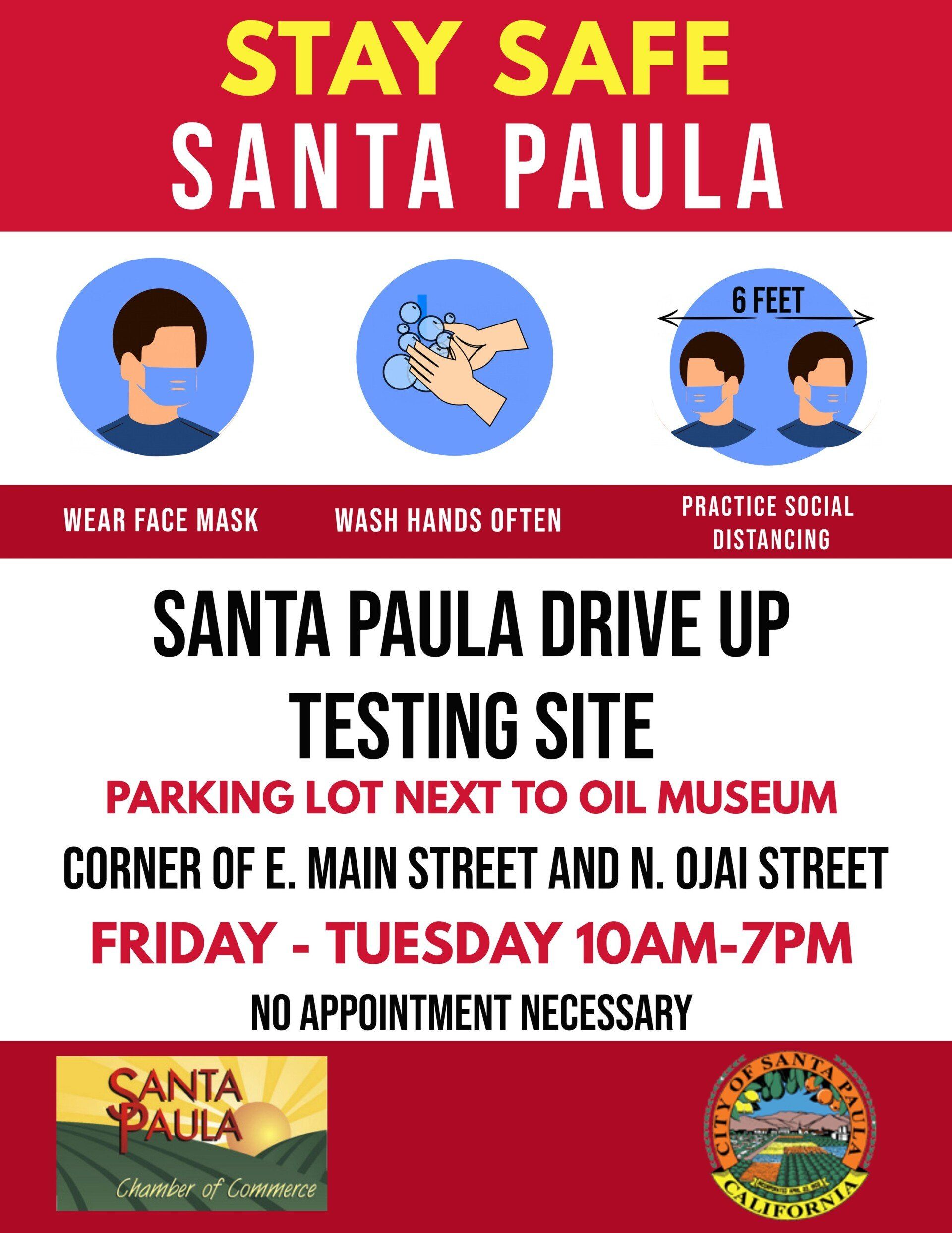 Durante la temporada navideña, las reuniones sociales y familiares son más comunes. Siga las pautas de coronavirus federales, estatales y locales recomendadas. Use una mascarilla, lávese las manos con frecuencia y practique el distanciamiento social son formas en las que puede ayudar a retrasar la propagación del virus. Las pruebas para el coronavirus están disponibles en Santa Paula. El sitio de prueba de conducción se encuentra en la esquina de Main Street y Ojai Street junto al Museo del Petróleo de California. Está abierto de viernes a martes de 10 a. M. A 7 p. M. No se necesita cita previa.